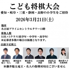 | 2026/03/21~21 | こども将棋大会 ~愛知・岐阜・三重・静岡・長野の小学生をご招待開催のお知らせ~ | |