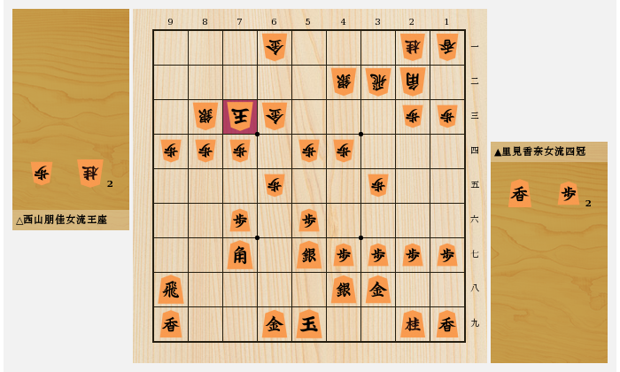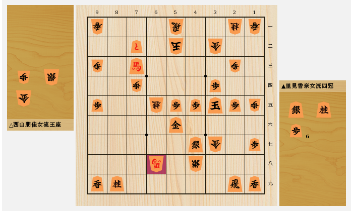 先手の勝負手が実り、ようやく逆転にこぎつけた。▲6三銀△同角▲5三角が強手。△同金▲同桂成△7二玉▲6三金△8二玉▲7五歩で先手勝勢だ。逆転で西山が制し、決着は最終局へ。