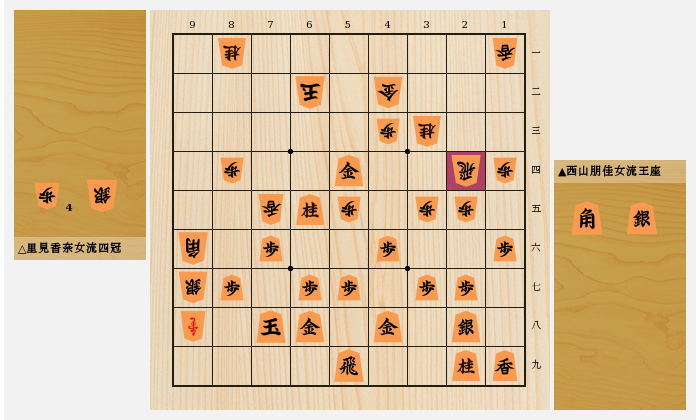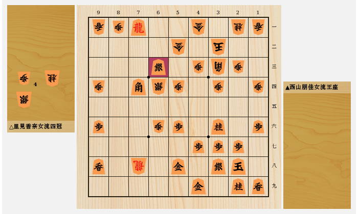 第4局からは東京都渋谷区「東京・将棋会館」にて。相振り飛車から角交換になって手将棋となった。後手の里見が優勢になるが、西山も必死に攻めて楽をさせない。