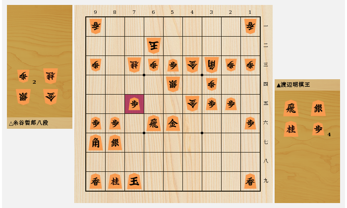 ここから△5三玉▲3二飛△6六角▲同金△4四玉が糸谷らしい指し回し。中段玉を安定させて寄らない格好を作り上げた。以下は反撃に転じ、先手玉を寄せ切っている。糸谷が後手番で大きな先勝。