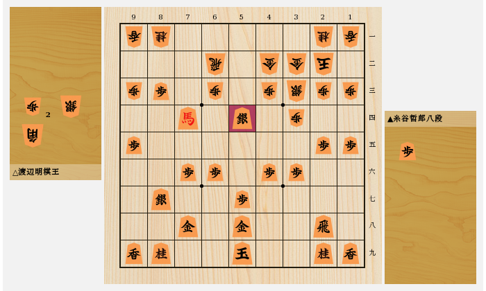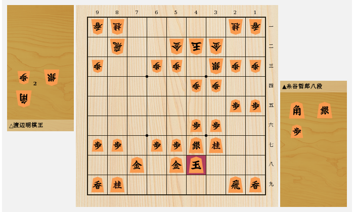第4局は東京都渋谷区「東郷神社」にて。角換わりから第2局同様、渡辺は急戦を目指し、糸谷は居玉のまま両端を突き越して攻めを待つ。