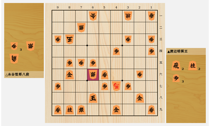 後手が追い込み、ついに先手玉に詰めろが掛かっている。だが、▲5三飛がギリギリで踏みとどまった一手。△6三歩と使わせて先手玉の詰めろが消え、▲9五桂△8二玉▲7三歩と反撃して先手の一手勝ちだ。冷や汗をかいた渡辺だが何とか逃げ切って2勝1敗とリード。