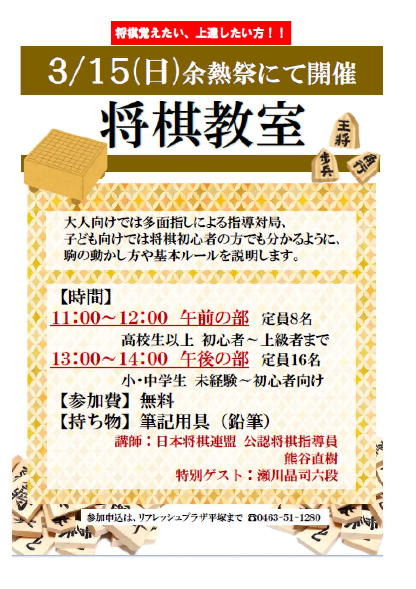 【詳細】 将棋教室募集開始/余熱祭2026 « リフレッシュプラザ平塚(外部リンク)