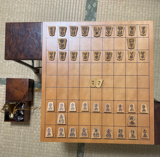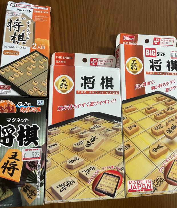現在我が家には将棋盤と駒が沢山ある。数えたら駒が7組、将棋盤が8面あった。いろいろな所で買ったりもらったりしている内にそうなってしまった。持ち運び用のマグネットのものも多い。