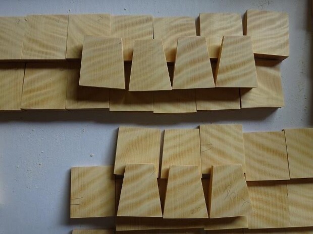 書体が決まったところで次は木地です。駒の形になる前の木をじっくり見て考えます。どれも模様が綺麗に揃っていて美しいです。華やかなのは孔雀杢で、その名の通り孔雀が羽を広げているように見えます。不規則な木目を楽しむことができますが、毎日使うには少し向かないでしょうか。逆に主張が少ないのは真っ直ぐ縦縞が入っている赤柾ですが、せっかくなら遊び心が欲しいなと思いました。目に留まったのは虎杢でした。斜めに入った縞が虎に似ています。はっきりした模様の中に優しさも感じられて、あまり迷わず決めた記憶があります。