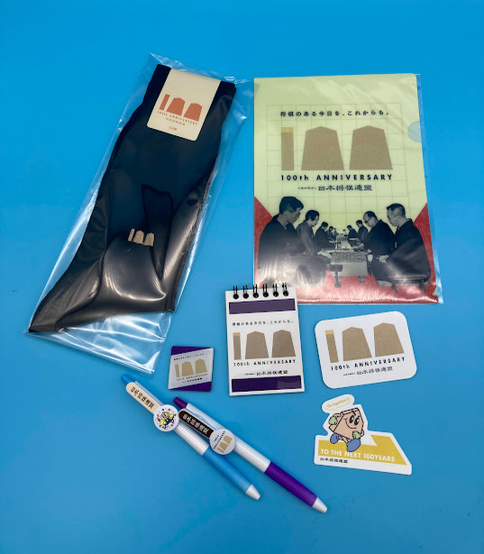100周年ロゴと日本将棋連盟カラーの紫をあしらったオリジナルデザインで、おみやげにもおすすめです。
