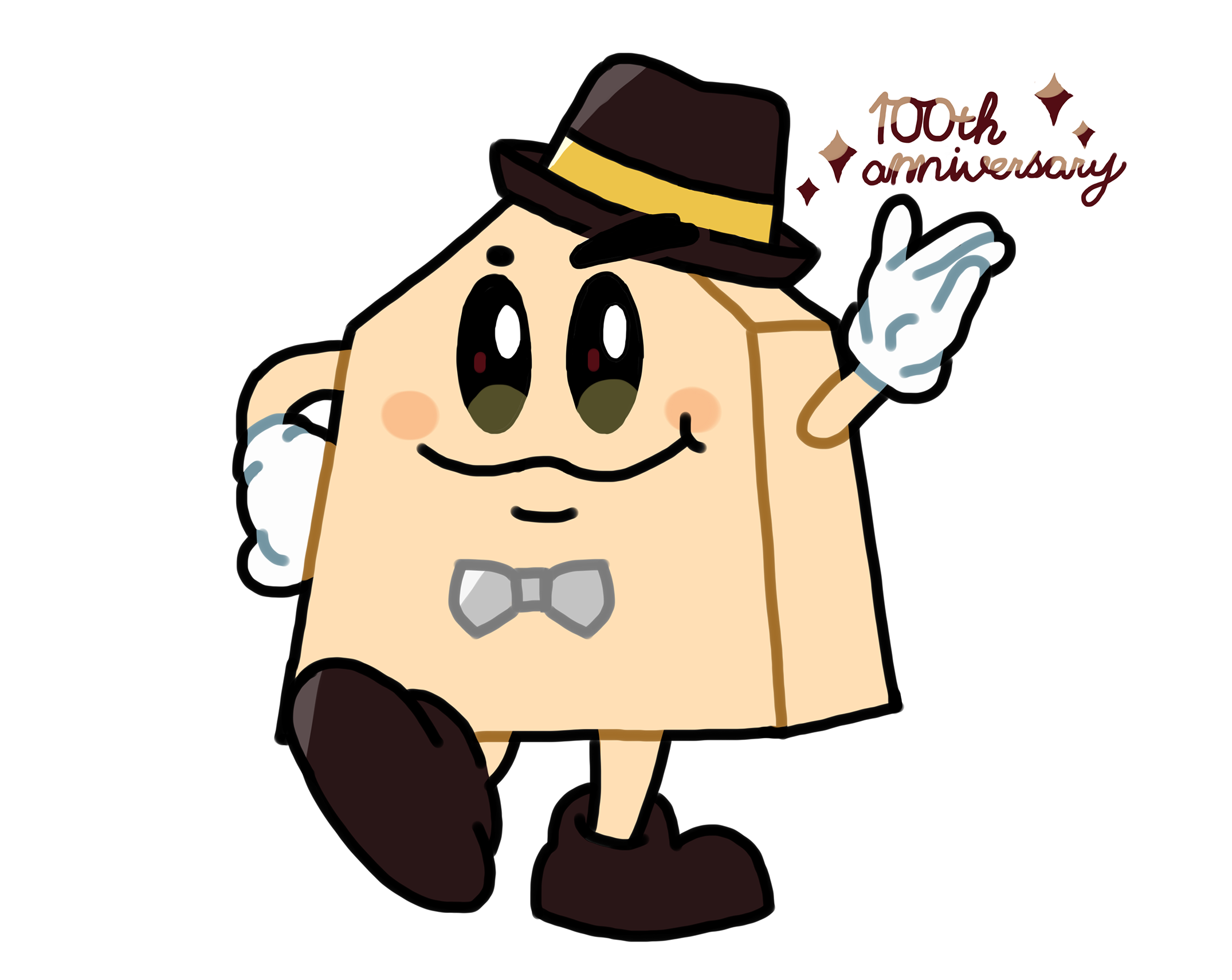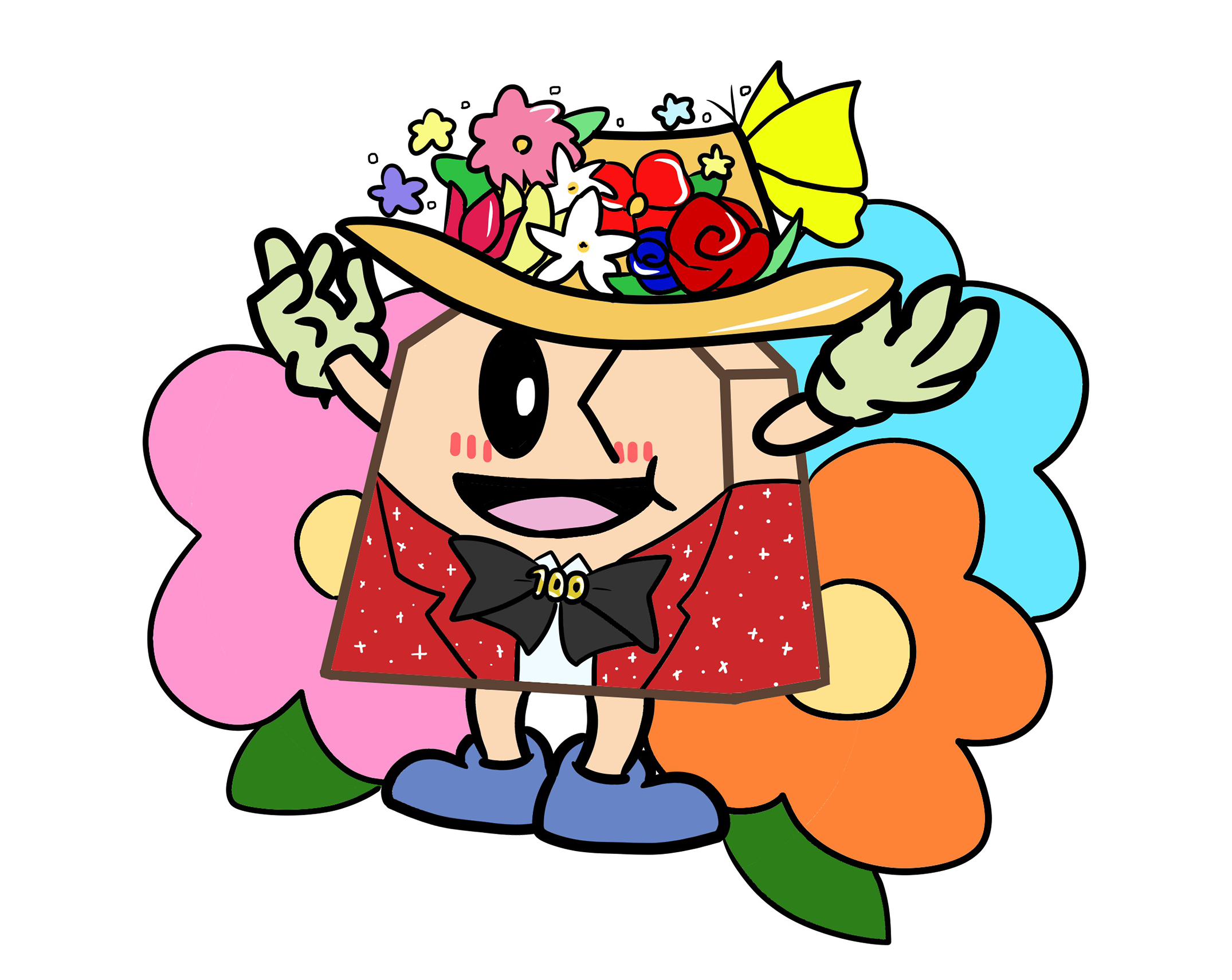 花がついてる帽子をかぶりお祝いしているSHOちゃんを描きました。たくさんの花や色を使い明るく華やかにしました。100周年ということで100という数字をリボンに使い、スーツにはラメをいれ明るくしました。