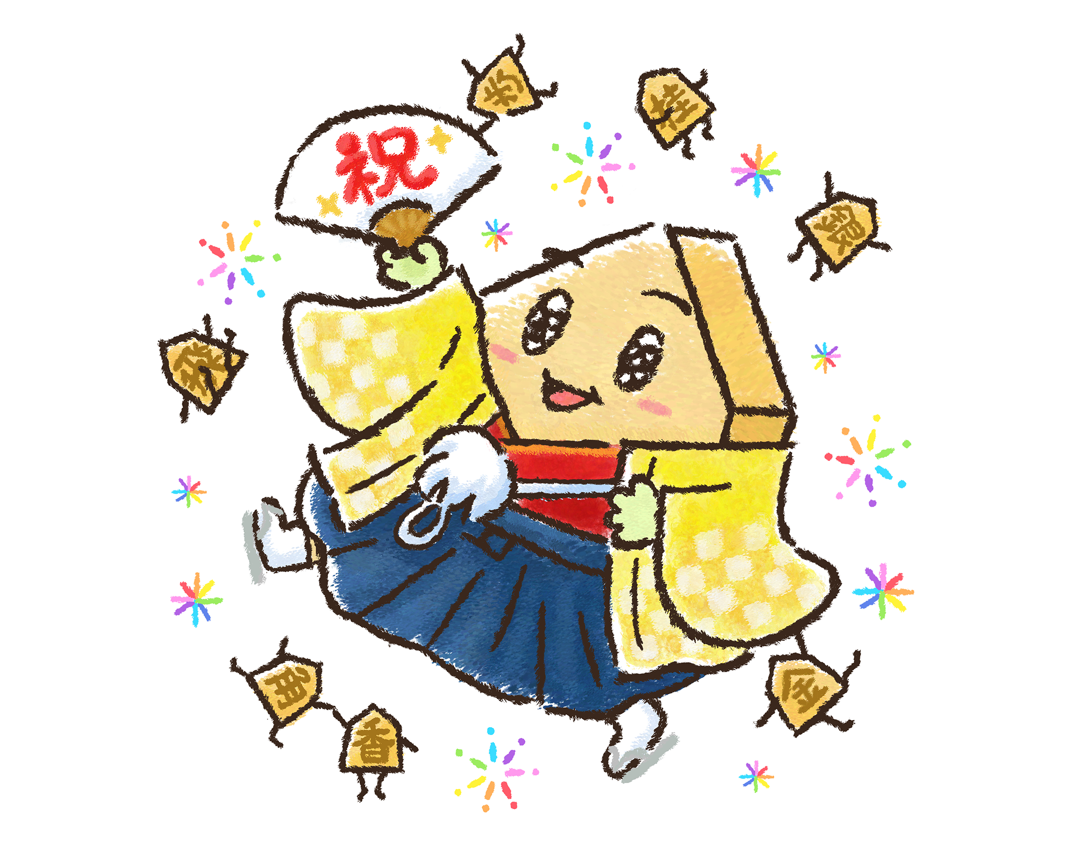 楽しそうにキラキラ全開でお祝いしているSHOちゃんとミニこまちゃんたちのイラストです。普段は見れない華やかな着物のおめかしSHOちゃんにしました。 将棋にふれる全ての人たちが、見るだけで気持ちが明るくなるようにという想いを込めて描いています!